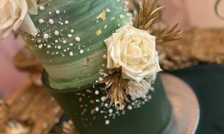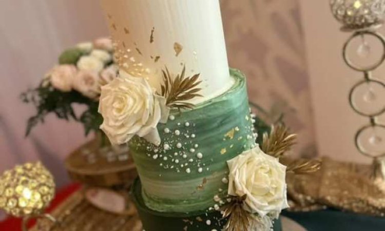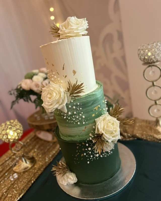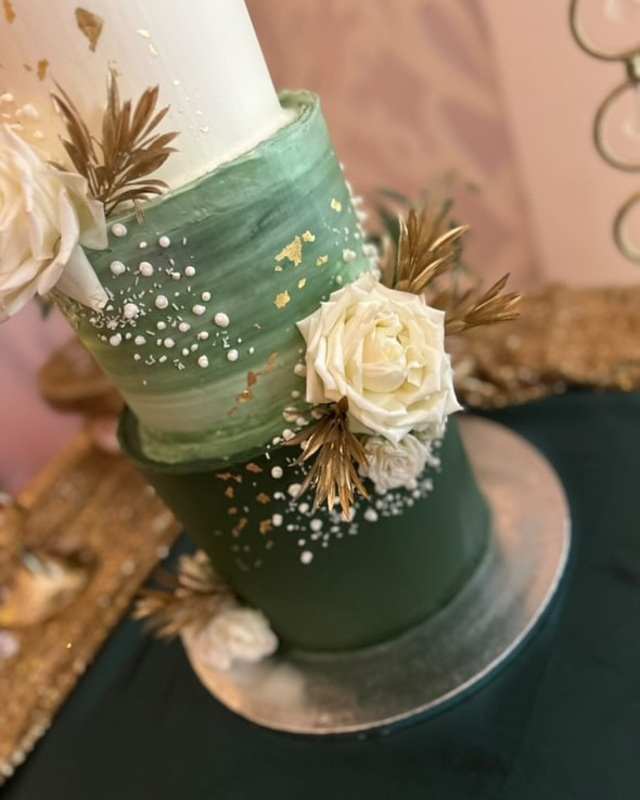 Ce gâteau à trois étages présente un travail minutieux sur les dégradés de couleur, du vert profond au blanc perlé. Les dorures subtiles et les finitions texturées rappellent les tendances contemporaines tout en conservant une élégance intemporelle. Les perles de sucre et les fleurs en harmonie complètent l’ensemble avec une touche de poésie.